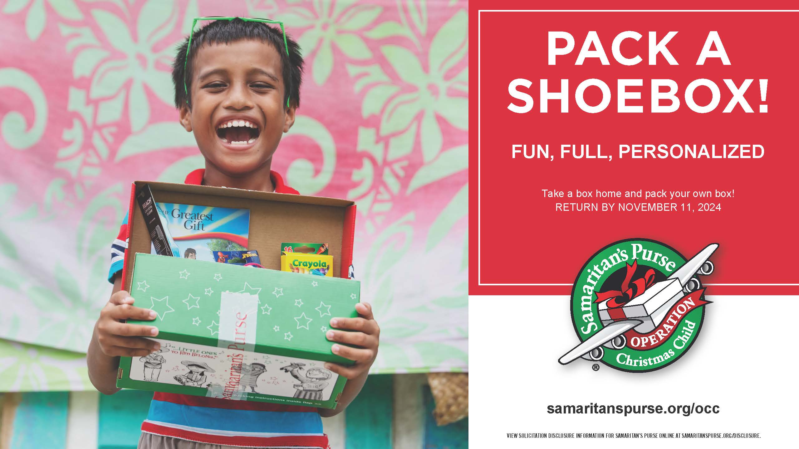 Pack-your-own boxes will be available at the church on Sunday, October 19! All packed boxes must be returned to the church no later than Sunday, November 9.